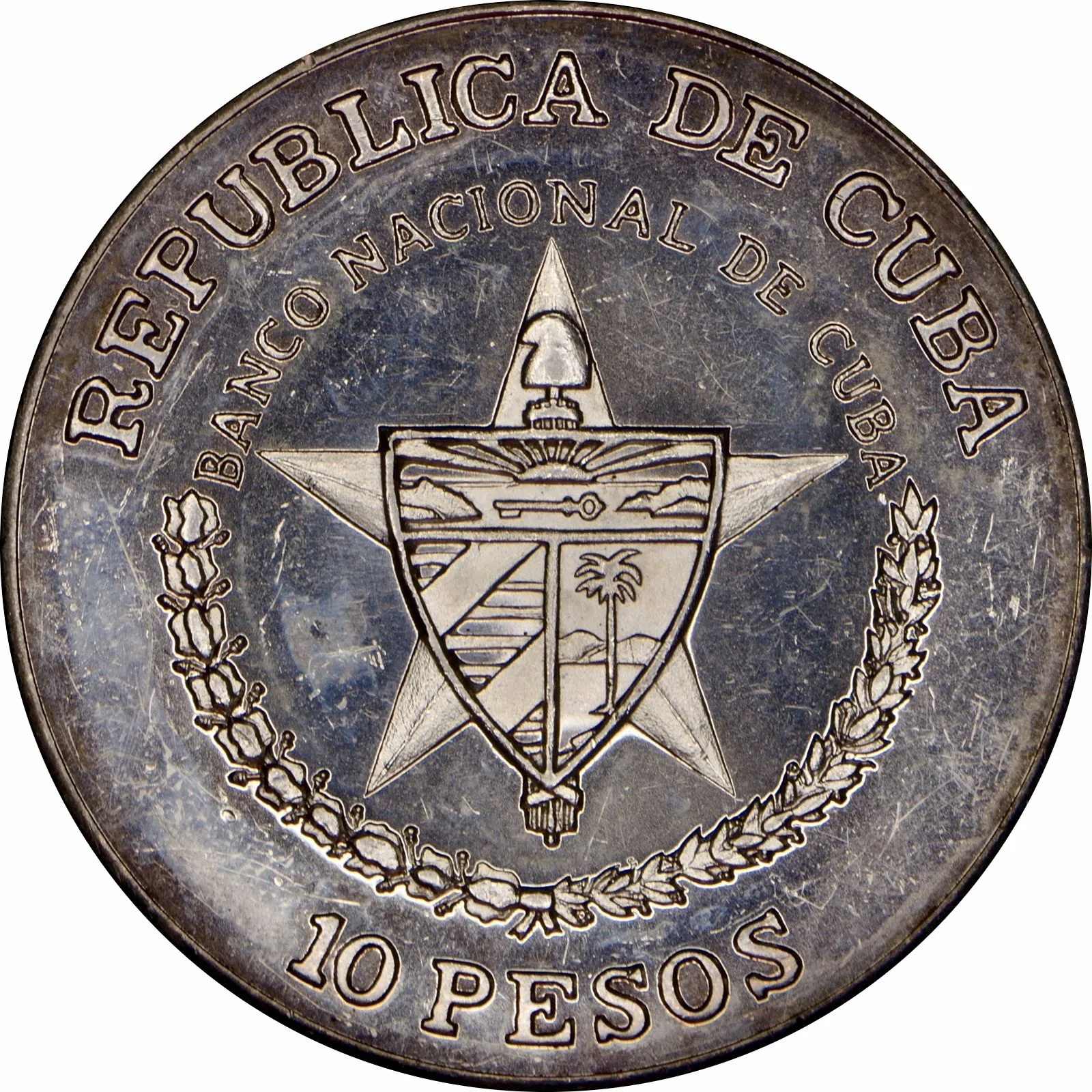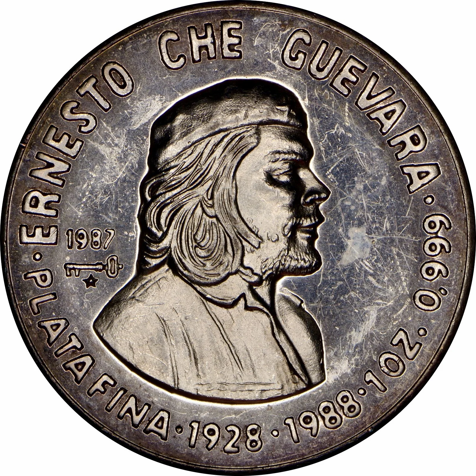 Ernesto "Che" Guevara (1928-1967) legend above, dates below. Left: issue date and mintmark. Right: metal, weight, and fineness.
