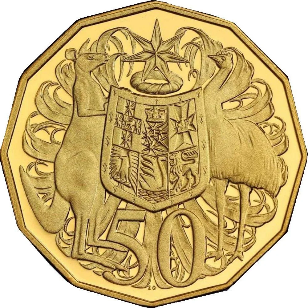 Australia's coat of arms, supported by a red kangaroo and an emu, with the numeral "50".