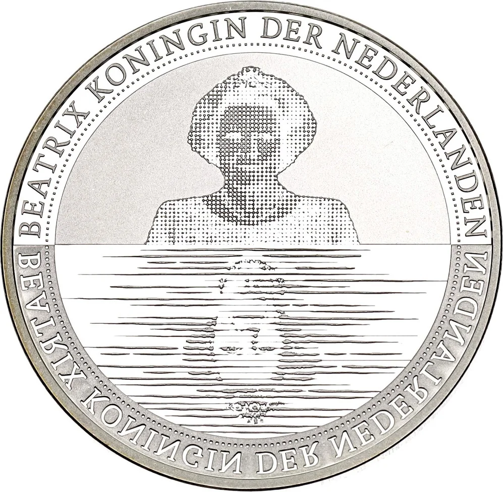 Queen Beatrix's portrait above, mirrored below as if on water.