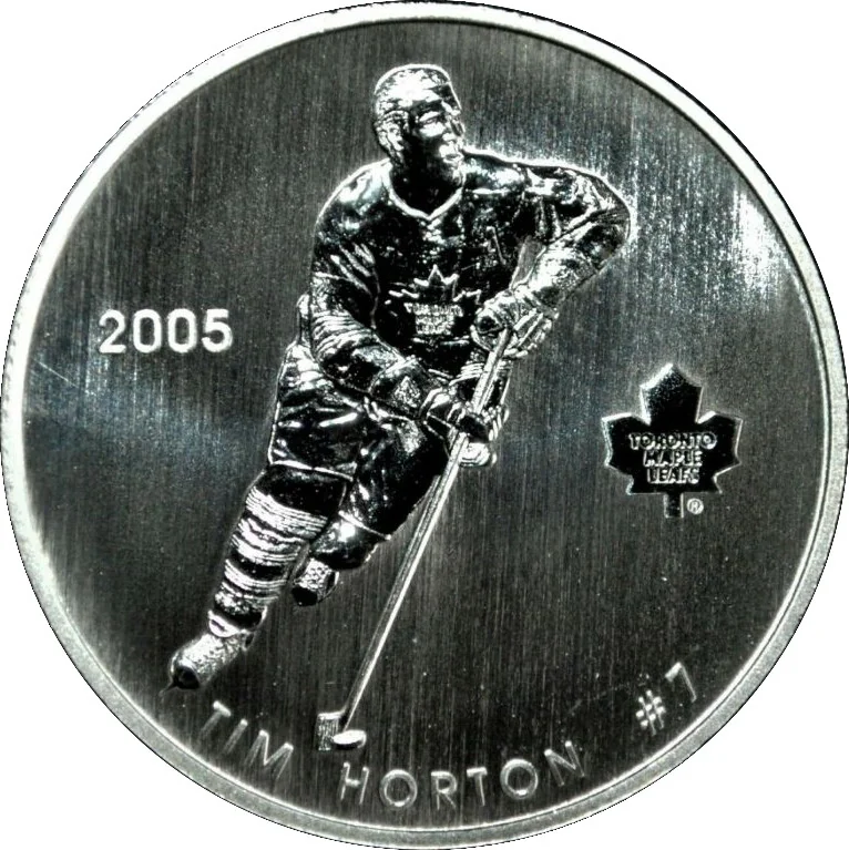 Tim Horton with hockey date left, Maple Leafs logo right.