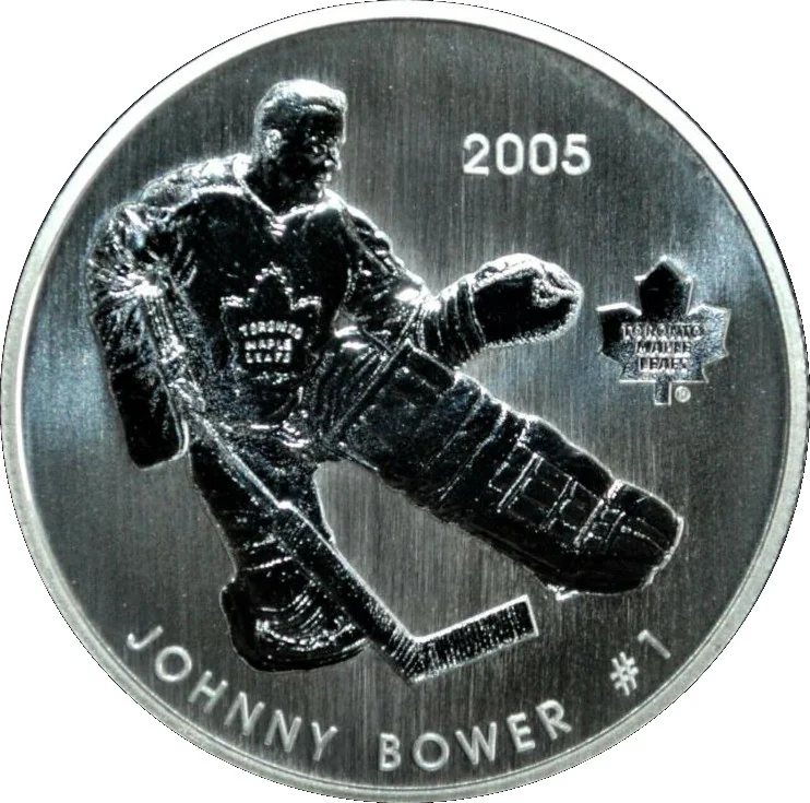 Johnny Bower playing hockey with the Toronto Maple Leafs logo to the right, the date above his glove, and his name and number below.