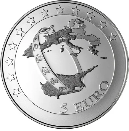 A transformed map shows Cyprus connected to Europe by a ring bearing repeated euro symbols. The design includes "5 EURO" and a semicircle of 12 EU stars on the outer ring.