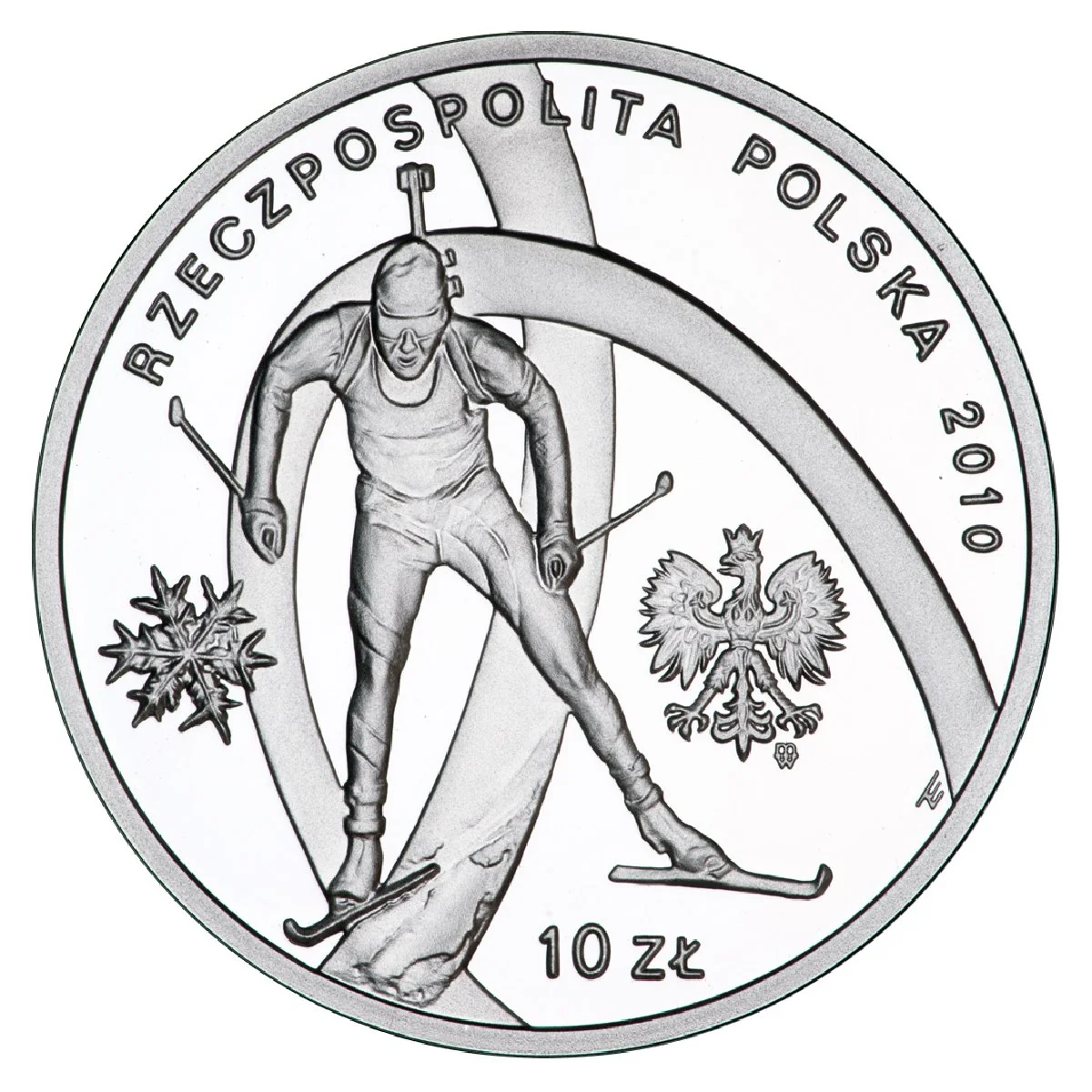 Right: Polish Eagle emblem. Center: stylized biathlete. Bottom: 10 ZL. Left: stylized snowflake. Semicircular inscription: RZECZPOSPOLITA POLSKA and 2010. Under eagle's left talon: Mint mark M/W.