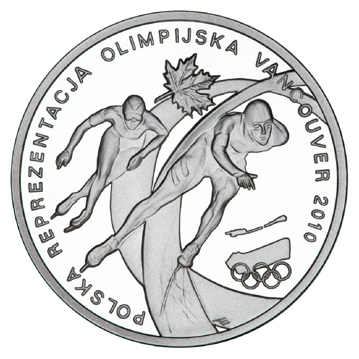 Two speed skaters under a maple leaf, with the Polish Olympic Committee logo. Rim text: POLSKA REPREZENTACJA OLIMPIJSKA VANCOUVER 2010.
