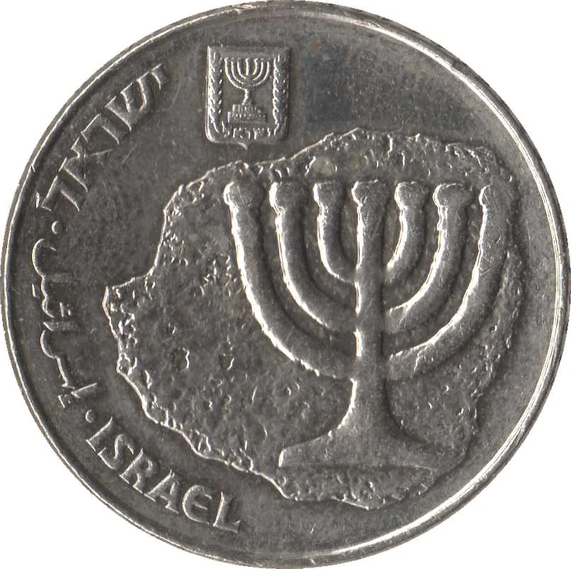 Replica of a Mattathias Antigonus coin (37-40 BCE) featuring the seven-branched menorah, Israel's state emblem, with "Israel" inscribed in Hebrew, English, and Arabic.