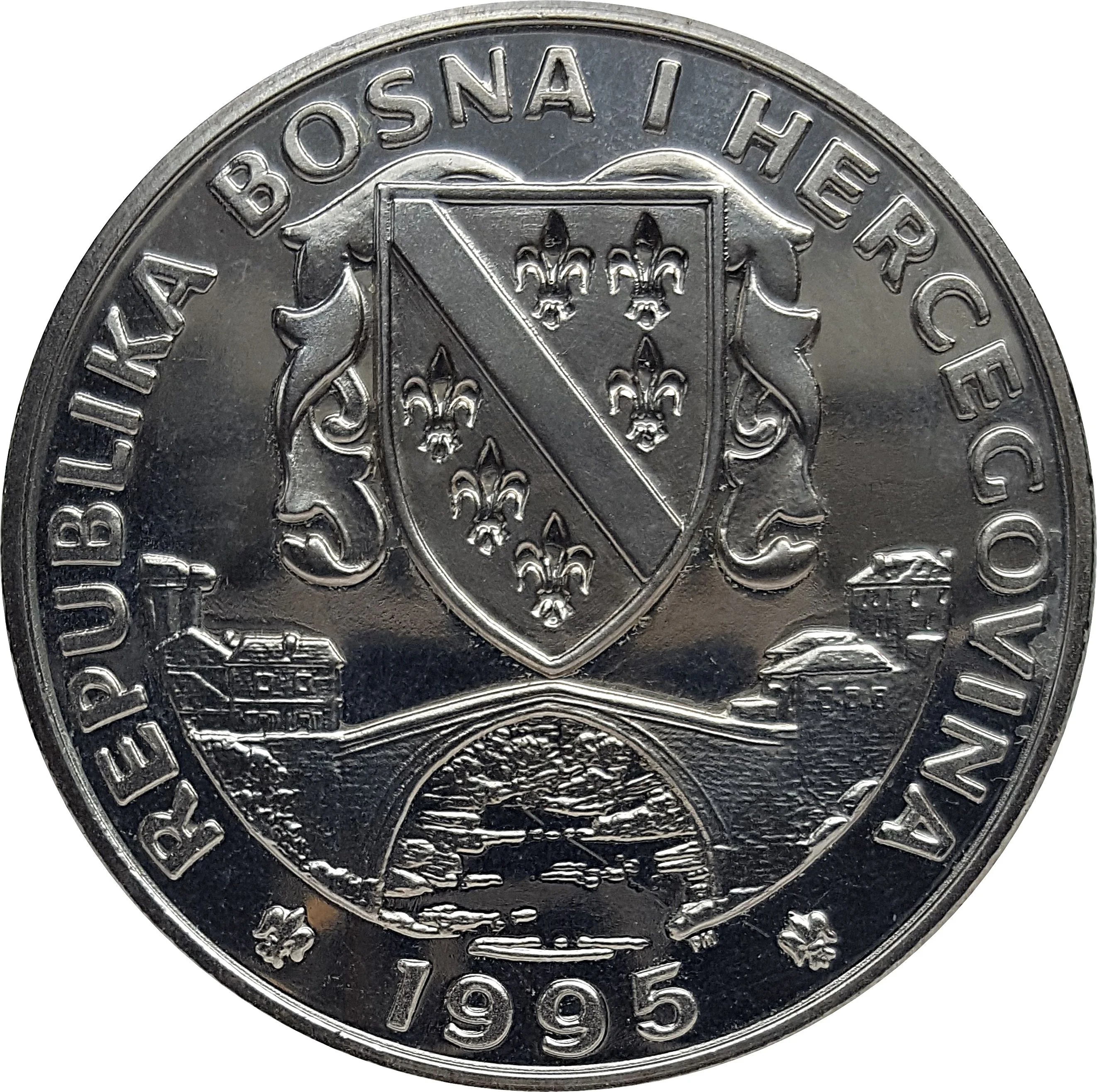 Bosnian emblem above Mostar Bridge; mintmark below bridge, right of date.