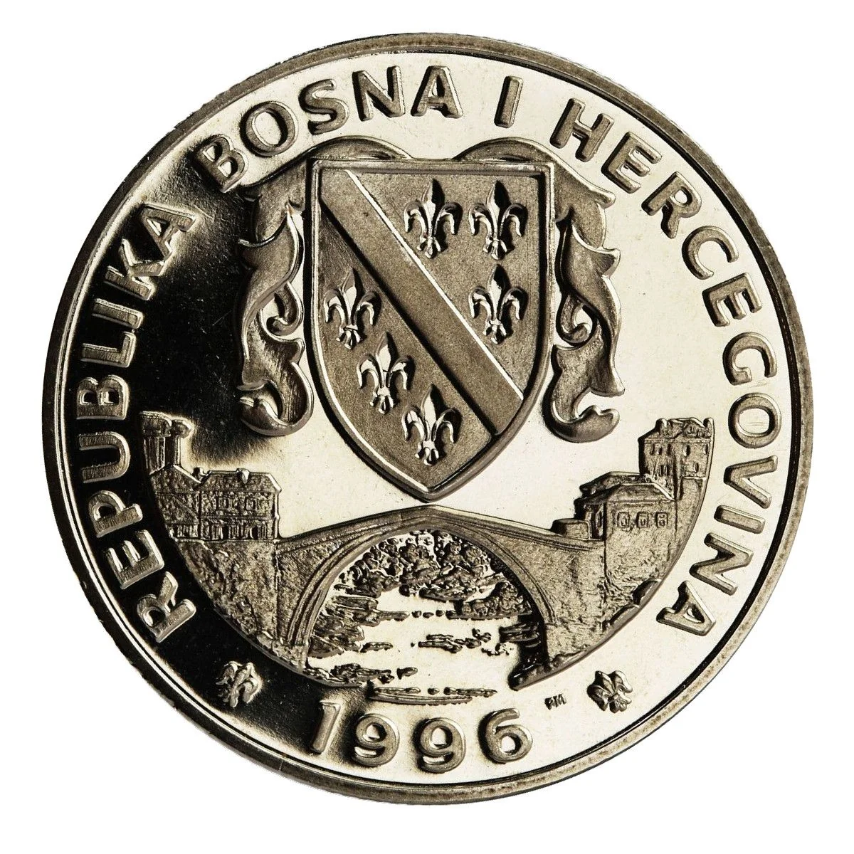 Bosnian emblem above Mostar Bridge; mintmark below bridge, right of date.