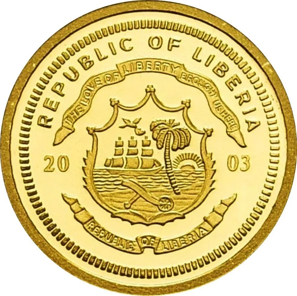 Liberian coat of arms divides date, denomination below.