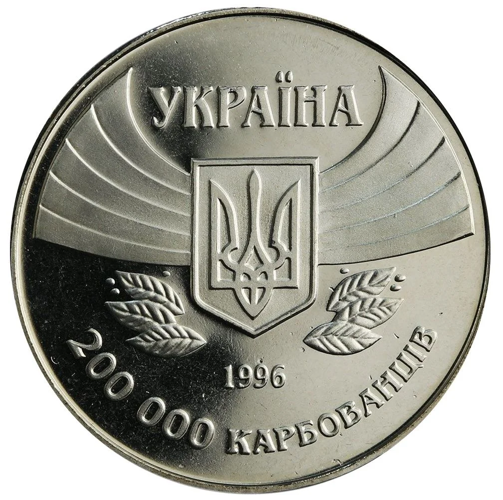 The Small State Emblem of Ukraine is flanked by laurel leaves and stems. Above is "УКРАЇНА" and below, "1996". Around the circumference is "200000 КАРБОВАНЦІВ".