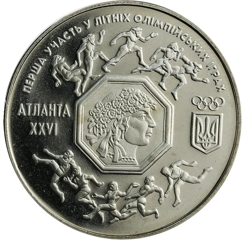 A central octahedron features Ukraine's symbolic maiden from the 1918 Narbut banknote. It is flanked by five ancient and five modern athletes. To its right is the National Olympic Committee of Ukraine emblem, and to its left, the inscription: АТЛАНТА XXVI.
