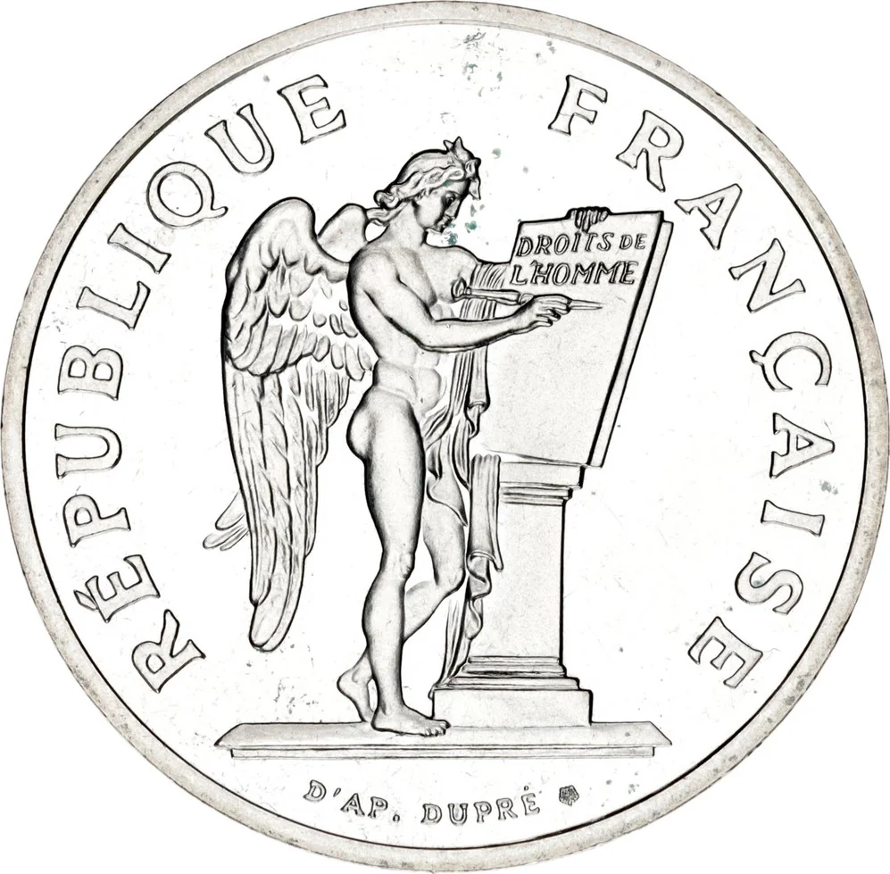 A genius writes "HUMAN RIGHTS" on a table, a motif from Augustin Dupré, encircled by "FRENCH REPUBLIC."