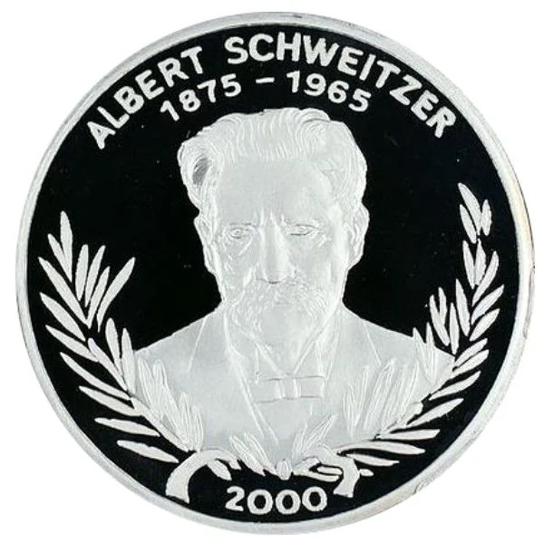 Albert Schweitzer facing forward, a wreath below.