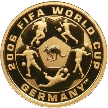Five footballers on a soccer ball's panels. The center panel features a kangaroo.