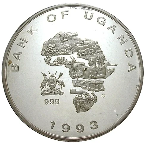 African landscape, people, and animals form a map, with Uganda's coat of arms at lower left.