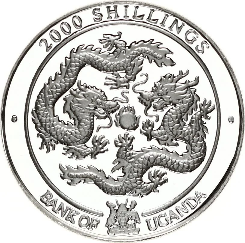 Two dragons flank a flaming ball within a circle, above Uganda's coat of arms.