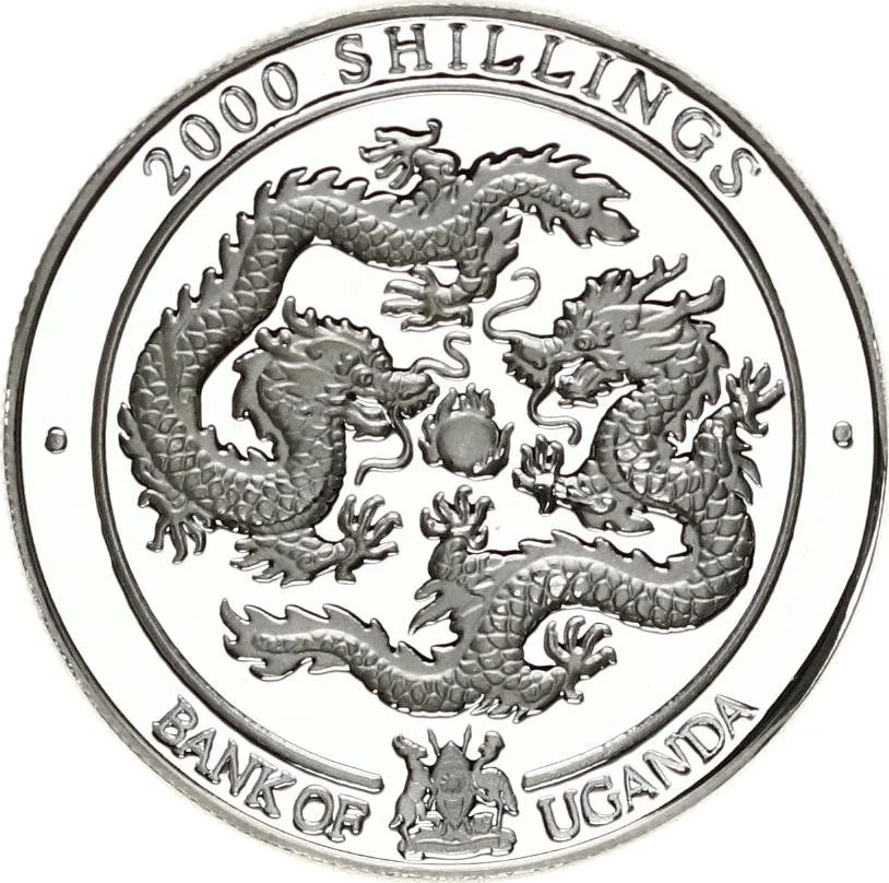 Two dragons flank a flaming ball within a circle, above Uganda's coat of arms.