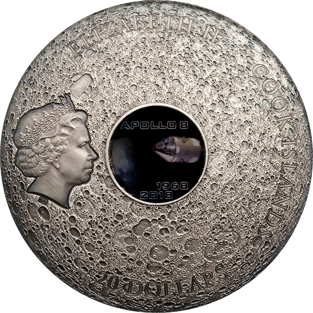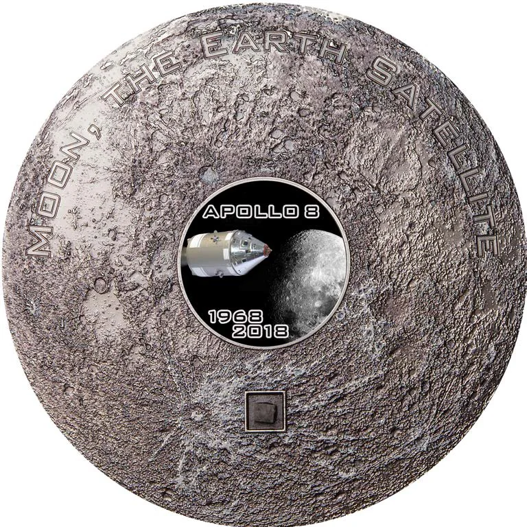 A moon crater relief with a central painted glass insert and a meteorite fragment at lower left.