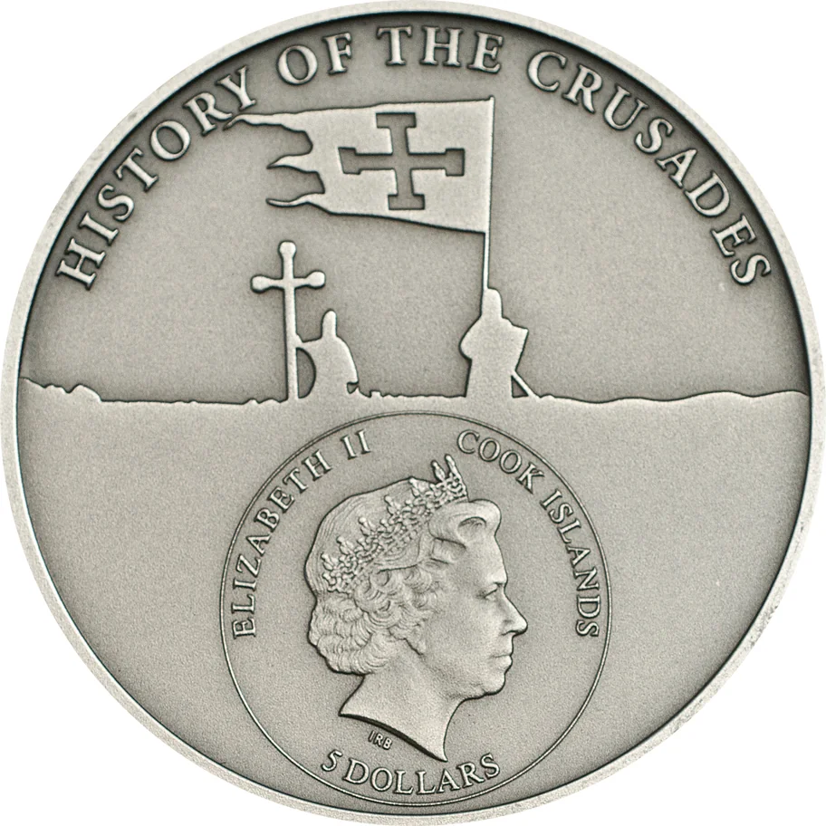 Templar silhouettes with banner and cross above; Queen Elizabeth II effigy below.