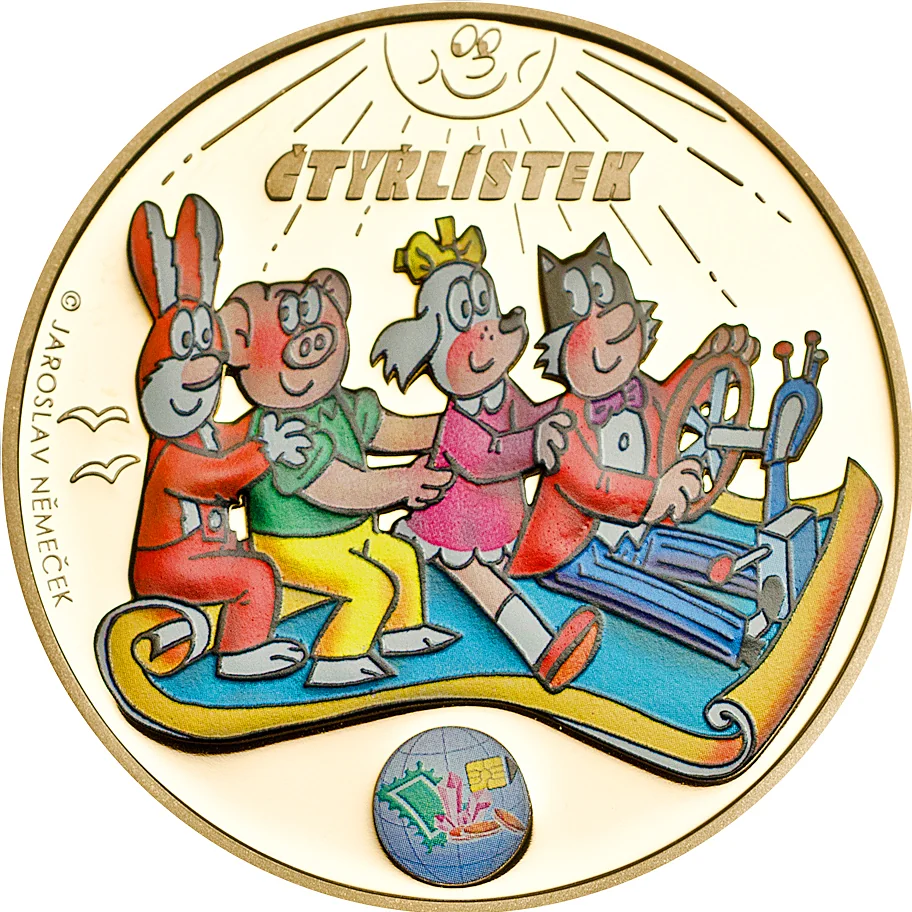 Čtyřlístek characters on a flying carpet: silly rabbit Pinda, tough pig Bobík, geeky cat Myšpulín, and pretty dog Fifinka.