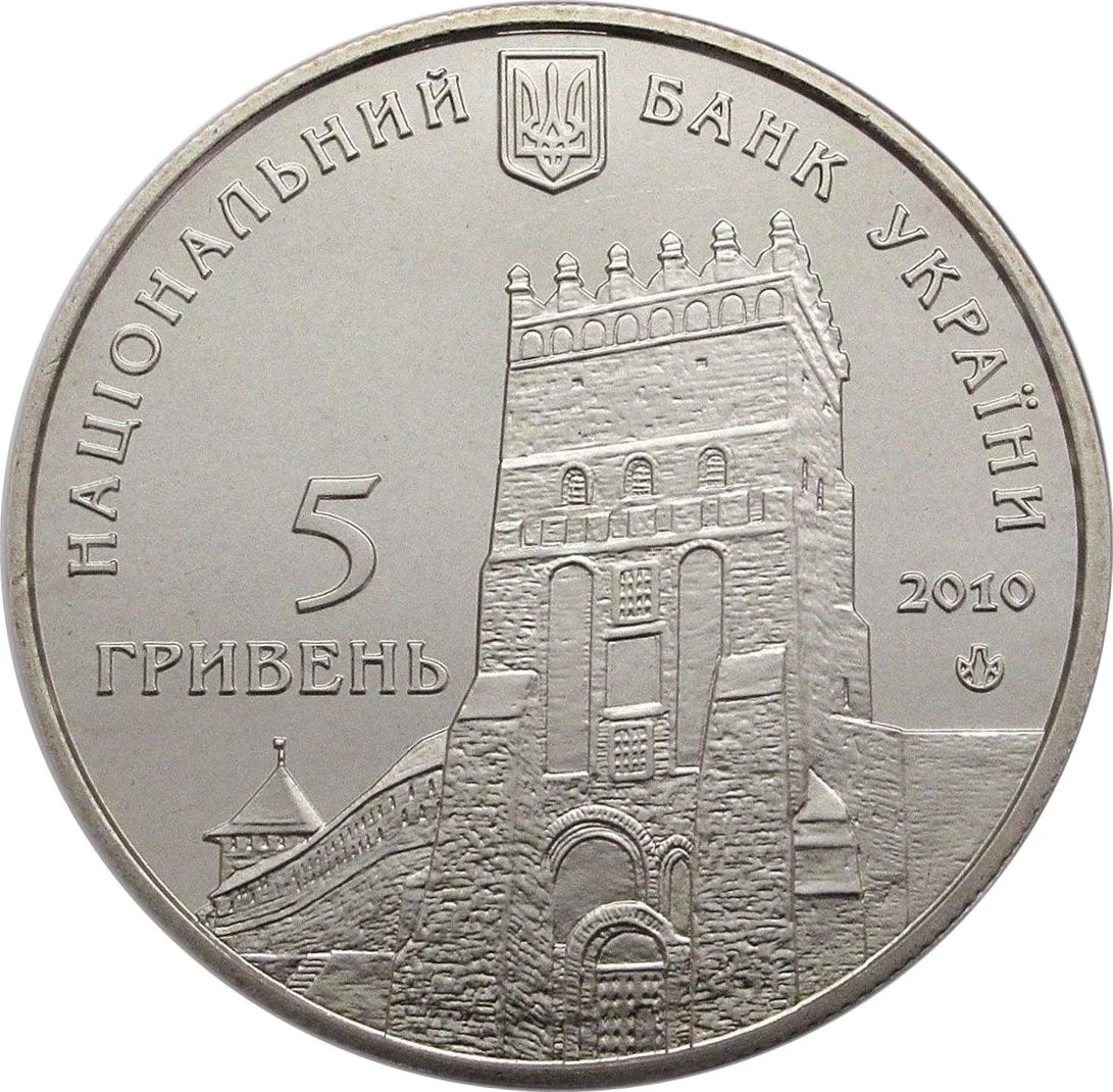 The obverse features Ukraine's Small Coat of Arms and the inscription "НАЦІОНАЛЬНИЙ БАНК УКРАЇНИ." The central design is the city's landmark Castle Entrance Tower, with the denomination "5 ГРИВЕНЬ" to the left and the year 2010 with the Mint's logotype to the right.