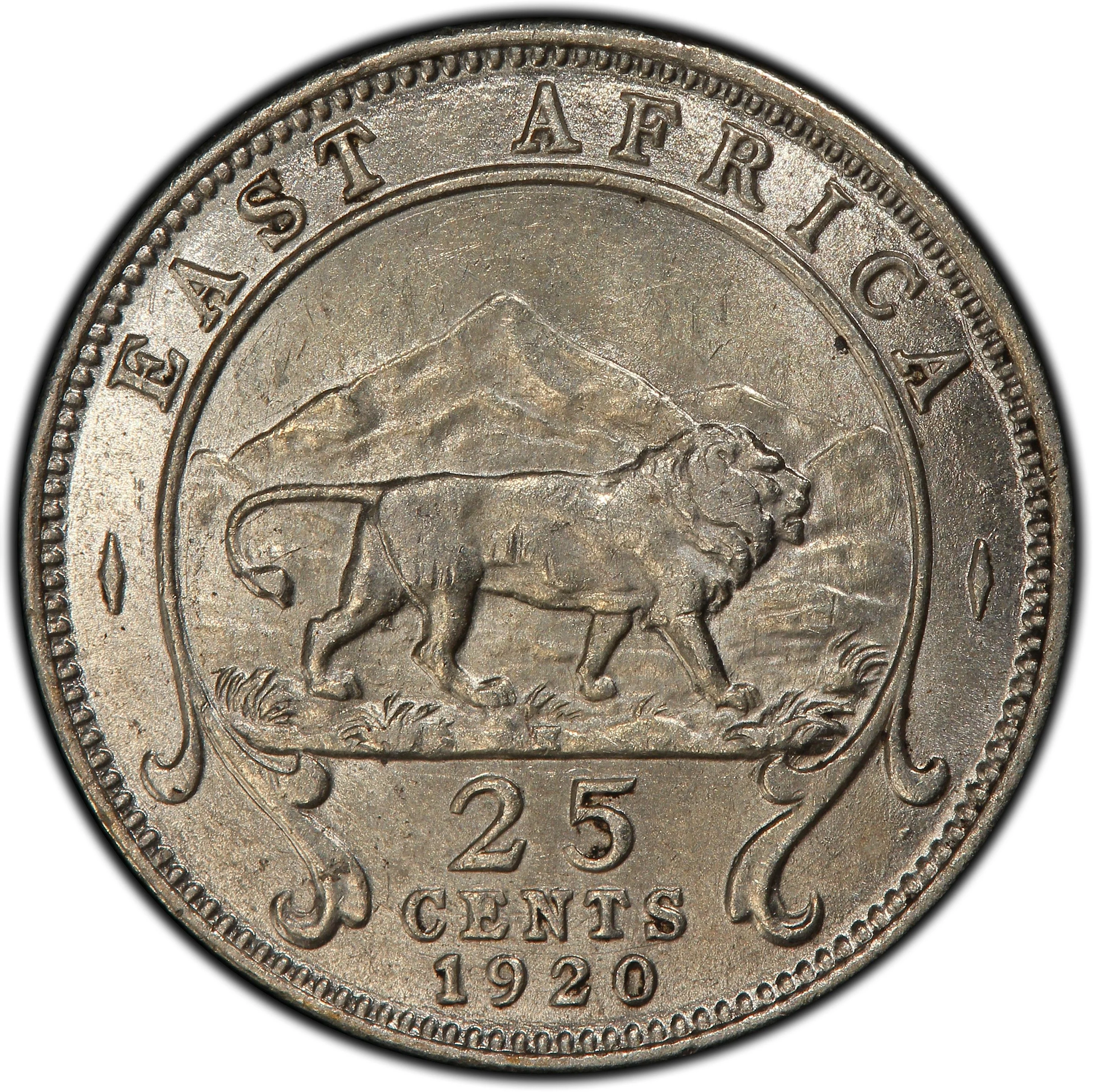 Lion merchant with Mount Kilimanjaro. Circular "East Africa" legend, face value, and year.