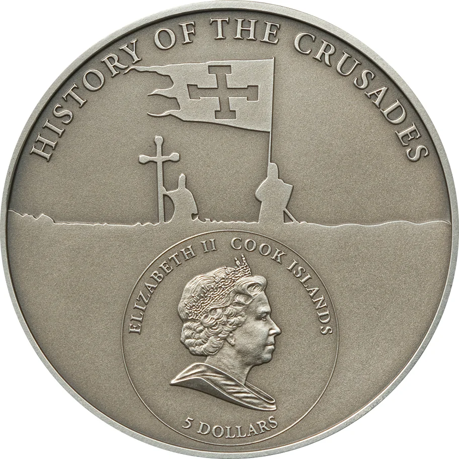 Crusaders on a battlement with a cross and flag; effigy of Queen Elizabeth II to the right, denomination below.
