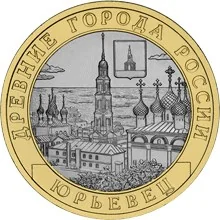 Panorama of Yuryevets with a river, its coat of arms, and the inscriptions "ДРЕВНИЕ ГОРОДА РОССИИ" and "ЮРЬЕВЕЦ" around the rim.