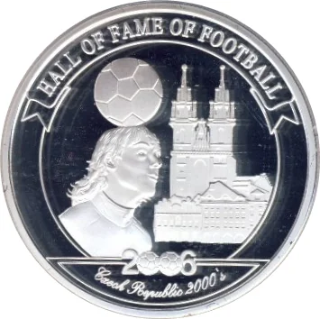 Pavel Nedvěd bust with ball, left; Prague's St. Vitus Cathedral in circle, right.