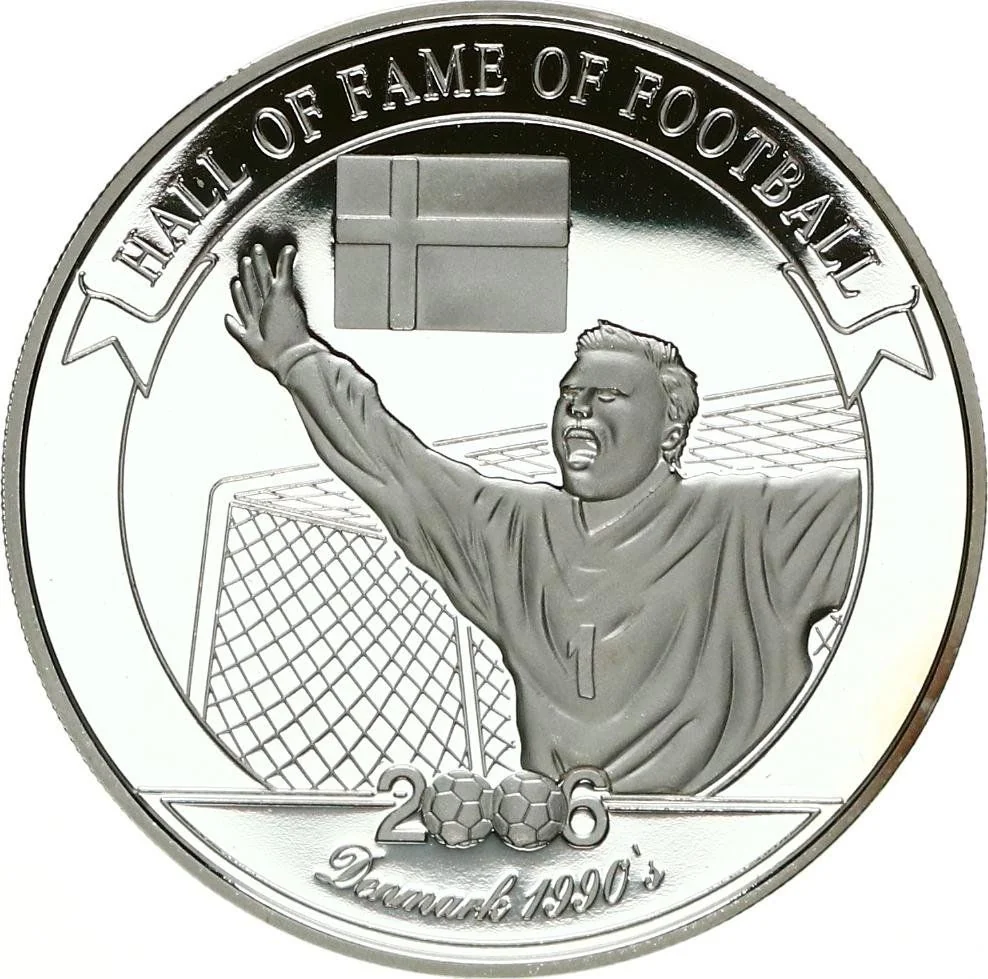 Peter Schmeichel celebrating before a goal, Danish flag above.