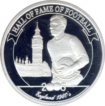 Bobby Moore holding a ball, facing left. Big Ben and the Palace of Westminster in a circle at left.