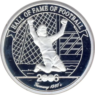 Harald Schumacher kneeling in goal, arms raised, stadium behind him.