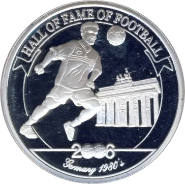 Lothar Matthäus running right with ball, Brandenburg Gate at right, within circle.