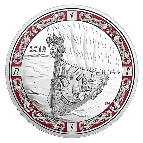 A Viking ship at sea, framed by Jellinge-style serpents and runes for the cardinal points, honoring their exploration.
