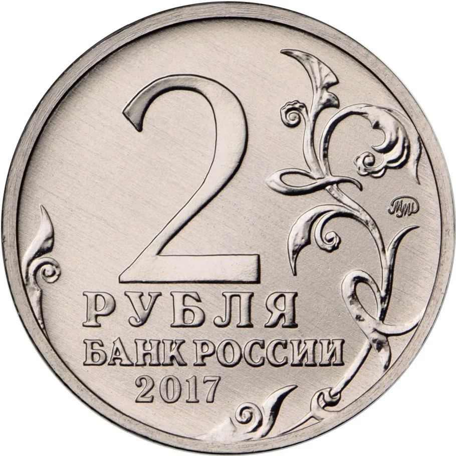 The obverse features the face value "2 РУБЛЯ," the inscription "БАНК РОССИИ," and the year "2017." It includes stylized plant branches on the sides and the Mint's trademark on the right.