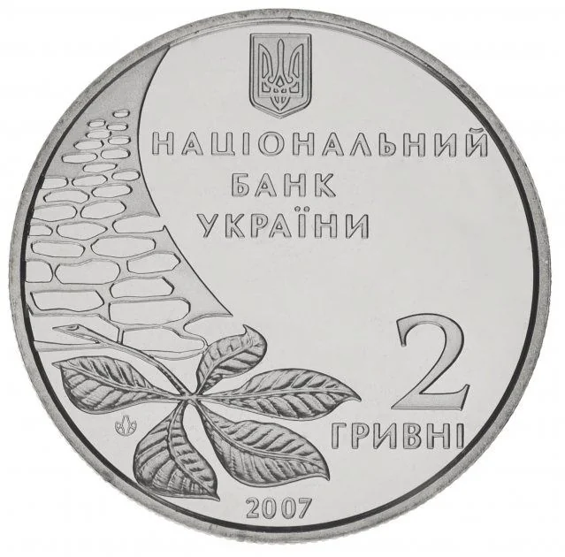 On a glass background: the Small National Emblem of Ukraine above the text "НАЦІОНАЛЬНИЙ БАНК УКРАЇНИ." Below, to the right, are "2 ГРИВНІ" and the year 2007. To the left is a chestnut leaf on pavement and the Mint's logotype.