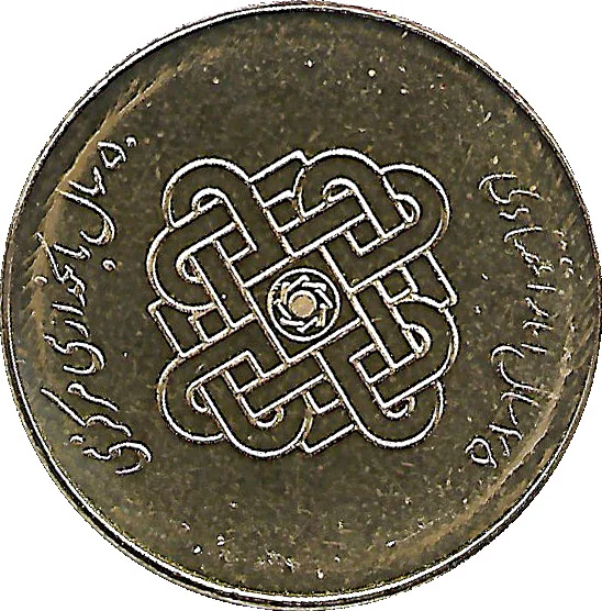 Denomination and symbol in center, with "Islamic Republic of Iran" and Mount Damavand above, mint year below. "Commemoration of World Statistics Day" on right edge, "20 October - 28 Mehr" on left.