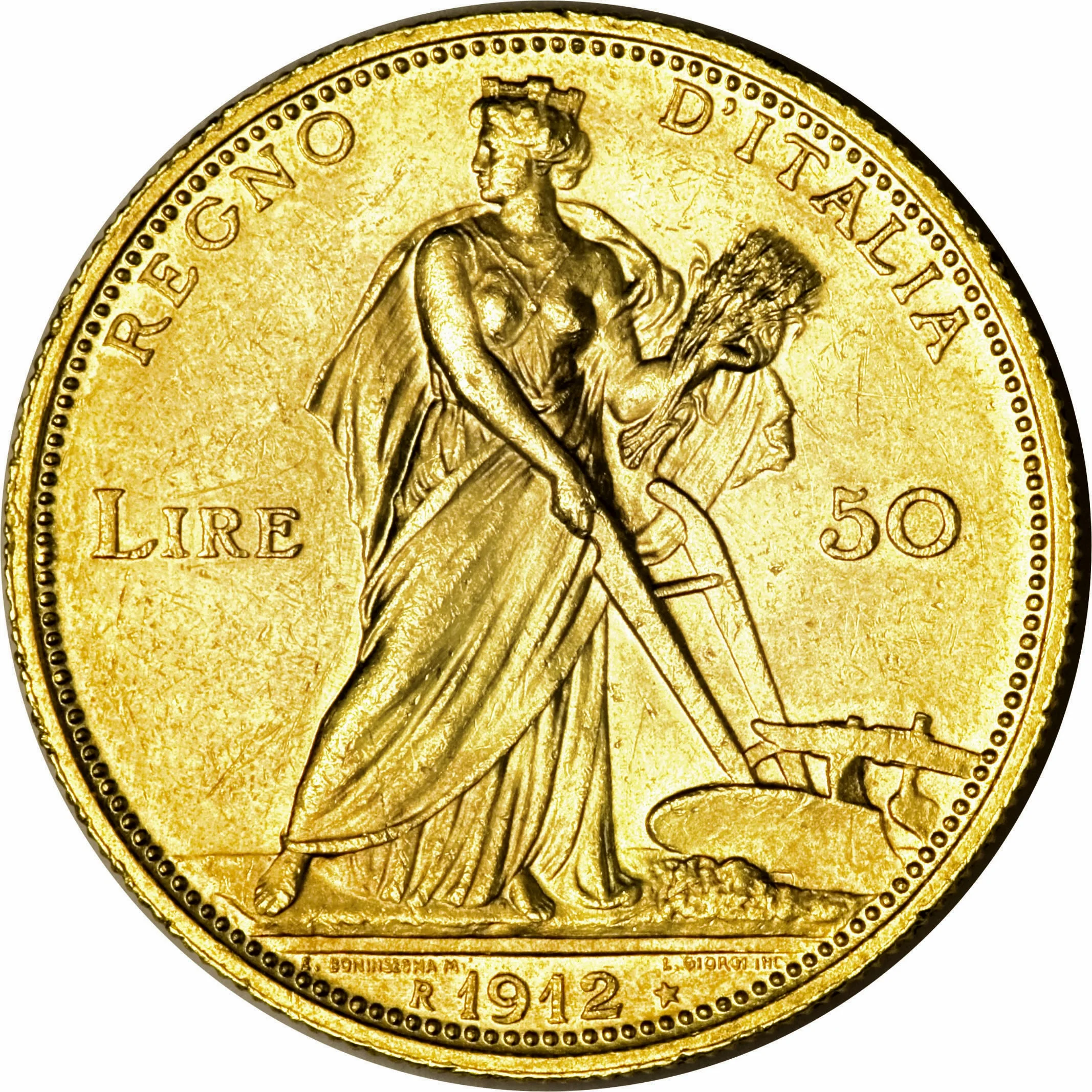 A female allegory of agricultural Italy holds a wheat sheaf and a plow. The value is on either side, with the engraver, author, date, mint mark, and Star of Italy in the exergue below.