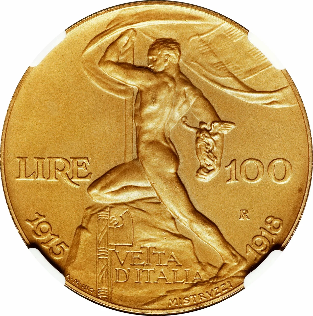 Description: A running man kneels on a rock, holding Italy's flag and a small winged Victory. The rock bears a carved fasces, "VETTA D'ITALIA", the author's name, and engraver's initials.