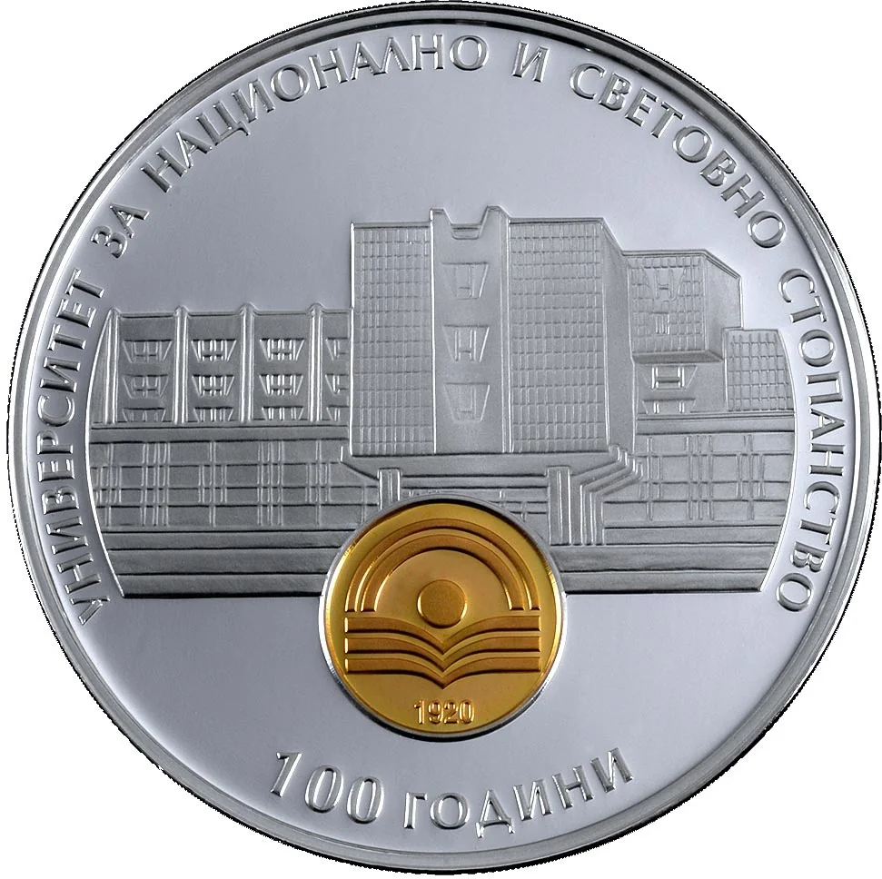 Description: The reverse features the university's building and gold-plated logo, encircled by the inscriptions "УНИВЕРСИТЕТ ЗА НАЦИОНАЛНО И СВЕТОВНО СТОПАНСТВО" and "100 ГОДИНИ".