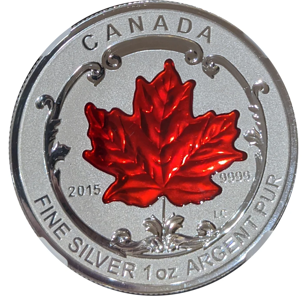 A frosted silver coin with an incuse sugar maple leaf, filled with red translucent enamel.
