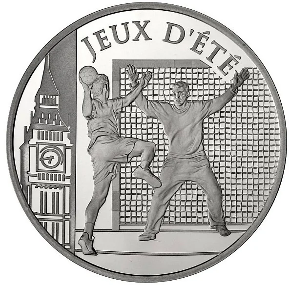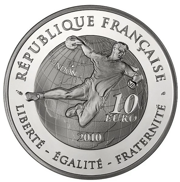 A handball player before a globe marked "2010", "LONDON", and "10 EURO". Around the globe's border are "RÉPUBLIQUE FRANÇAISE" and the motto "LIBERTÉ - ÉGALITÉ - FRATERNITÉ".