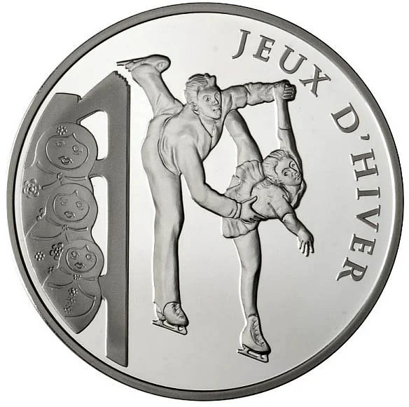 A figure skater before a globe inscribed with "2011", "SOCHI", and "10 EURO". Around the globe's border are "FRENCH REPUBLIC" and the motto "FREEDOM - EQUALITY - FRATERNITY".