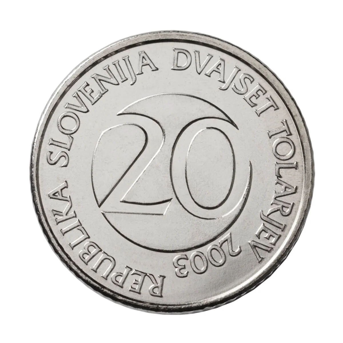 A circular coin with an embossed "20." On the left, "REPUBLIKA SLOVENIJA" curves upward, while "DVAJSET TOLARJEV" curves down on the right. The mint year is at the bottom.