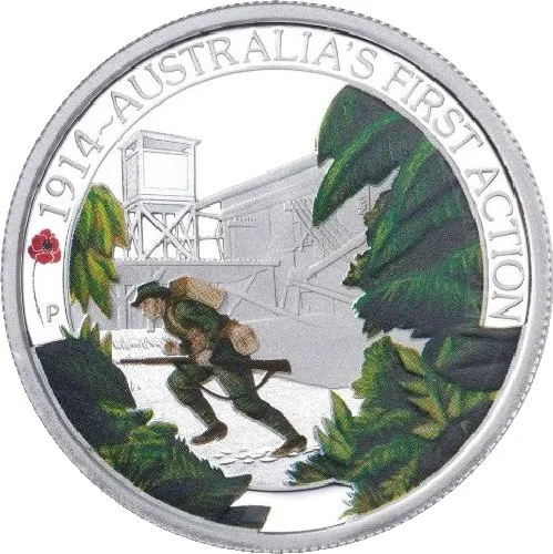 Australian soldier advancing under fire at Bita Paka, 1914 – Australia’s First Action, with a red poppy and Perth Mint ‘P’ mintmark.