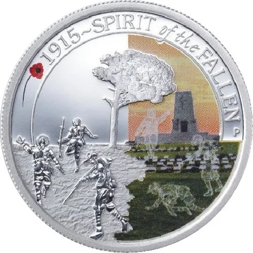 The design shows the 1915 Lone Pine battlefield with soldiers, transitioning to the modern-day memorial in color with soldiers' spirits. It includes the inscription '1915 – Spirit of the Fallen', a red poppy, and the Perth Mint 'P' mark.