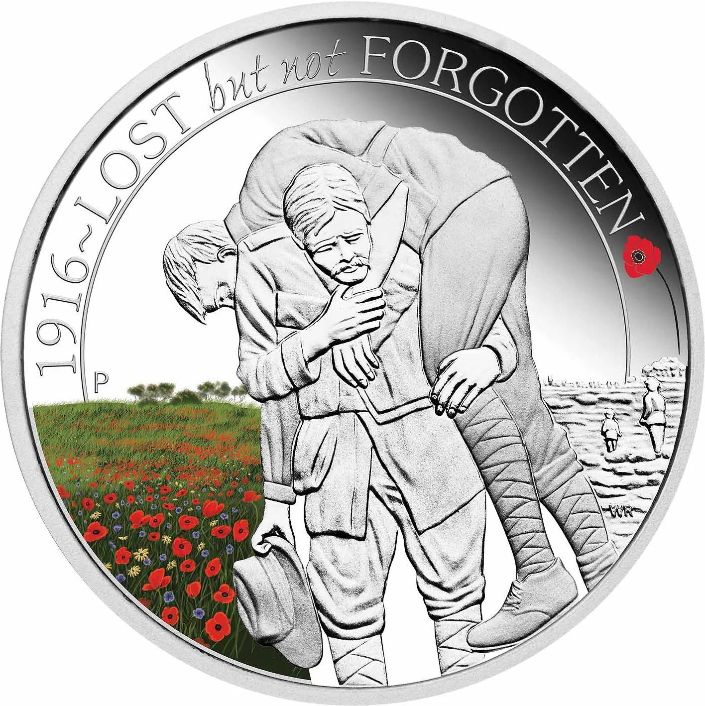 Peter Corlett’s ‘Cobbers’ statue, near Fromelles, is represented with a color field, a black-and-white no man’s land, the inscription ‘1916 – Lost but not Forgotten’, a red poppy, and The Perth Mint’s ‘P’ mintmark.