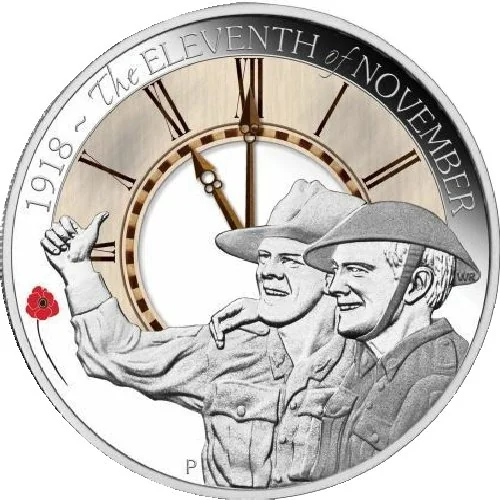 Two Australian soldiers celebrating the Armistice at 11am on 11 November 1918, with a clock and a remembrance poppy in the background.