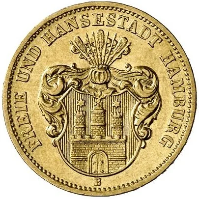 Hamburg coat of arms, helmeted and draped, encircled by legend.