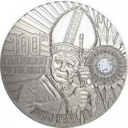 Pope John Paul II bust facing forward, wearing a mitre and holding a ferula. Crystal insert on the right.