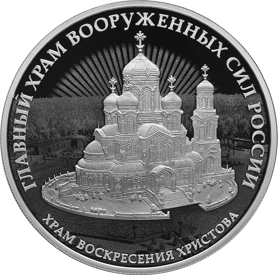 A relief of the Church of the Resurrection of Jesus Christ, encircled by the inscriptions ‘ГЛАВНЫЙ ХРАМ ВООРУЖЕННЫХ СИЛ РОССИИ’ above and ‘ХРАМ ВОСКРЕСЕНИЯ ХРИСТОВА’ below.